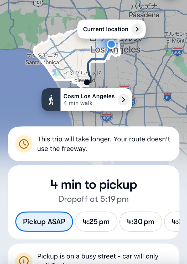 「今すぐ乗りたい!」という時、Waymoは少し不向きです。車両台数がまだ限られているため、配車を依頼してから到着まで30分ほど待つことも珍しくありません。移動の予定が決まっているなら、早めにアプリをチェックすることをお勧めします。予約などを駆使してうまく乗りこなしましょう!