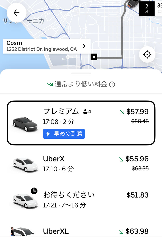 意外かもしれませんが、多くの場合でUberやLyftよりも安く設定されています。 +ドライバーへのチップが不要なため、表示価格のみで完結。物価高のLAにおいて、観光客にとっても現地住民にとっても強力な味方です。