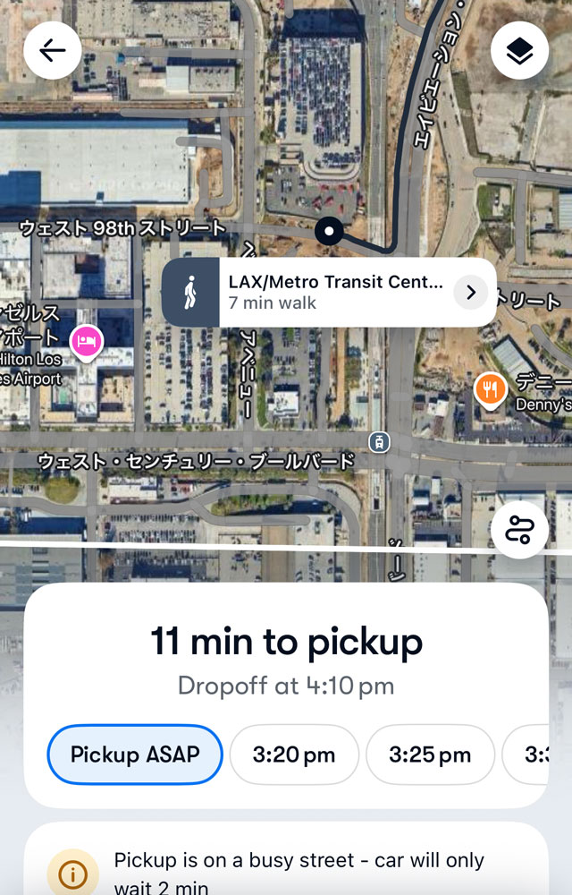 2026年時点でも、ロサンゼルス国際空港(LAX)のターミナル内への直接乗り入れは制限されてます。しかしながら、近隣まで行くことは可能で、例えば、LAX/Metro Transit Center Stationは目的地設定できるので、ここからシャトルバスを使って行くことも可能かと思います。(ご利用の際は最新情報をお確かめください。)また、治安が少し不安定な路地をルートとして選ぶこともあるため、夜間の利用は乗降場所をよく確認しましょう。